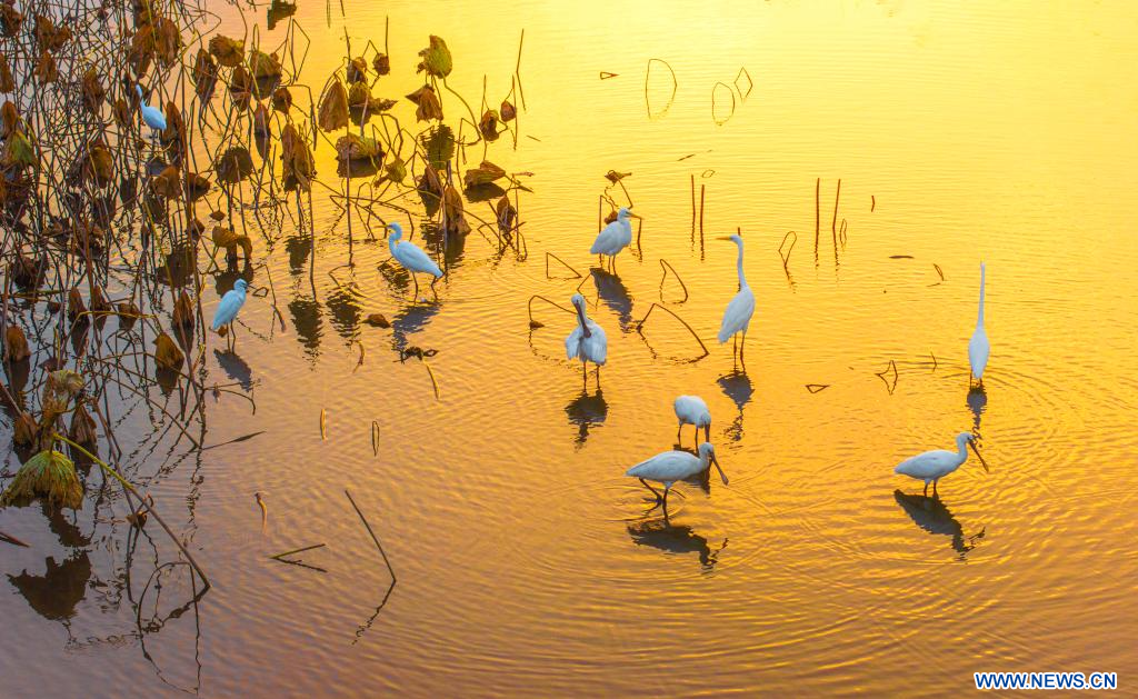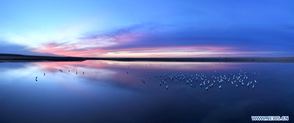 BEIJING, 11 novembre (Xinhua) -- Photo prise par drone montrant des aigrettes dans un réservoir du district autonome kazakh d'Aksay, dans la province chinoise du Gansu (nord-ouest), le 9 novembre 2025. (Photo : Gao Hongshan)