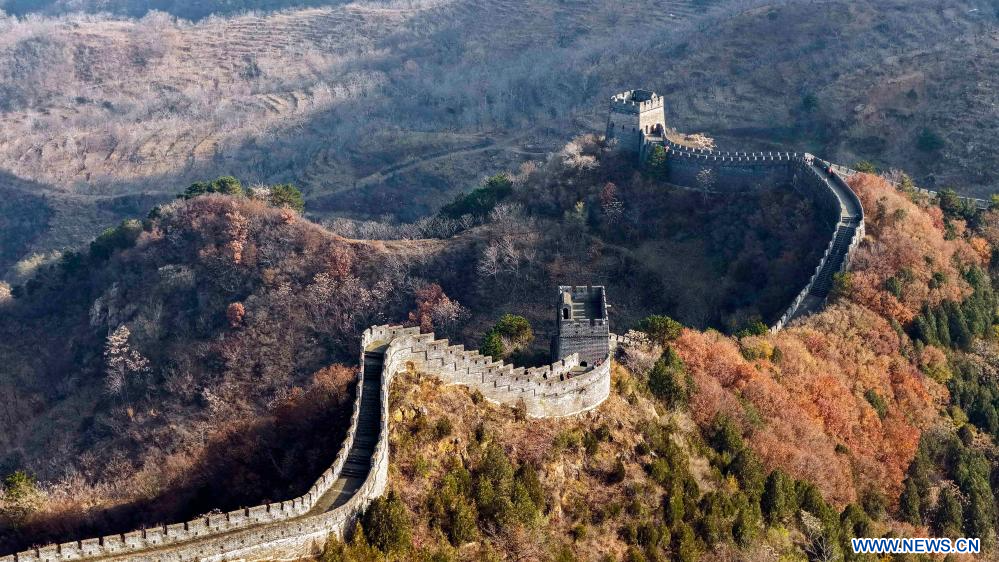 BEIJING, 11 novembre (Xinhua) -- Vue aérienne du tronçon Huangyaguan de la Grande Muraille, situé entre l'arrondissement de Jizhou de la ville de Tianjin et le district de Xinglong de la province du Hebei, dans le nord de la Chine, le 8 novembre 2025. (Photo : Liu Mancang)