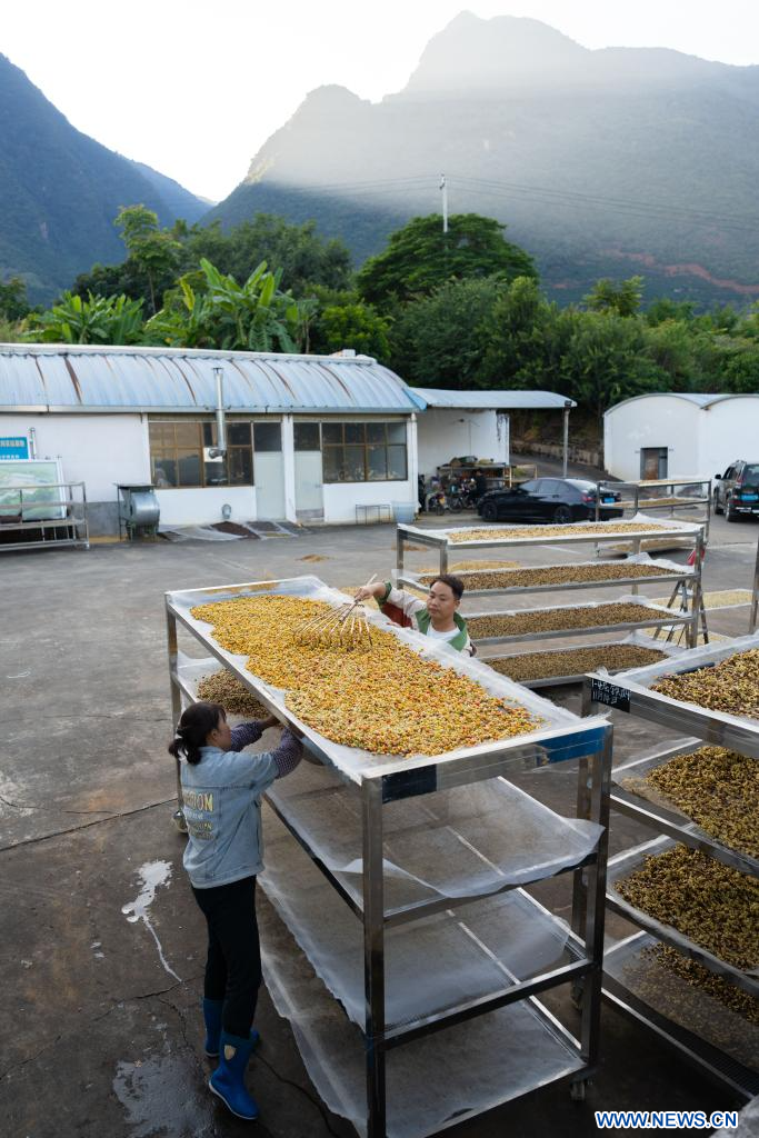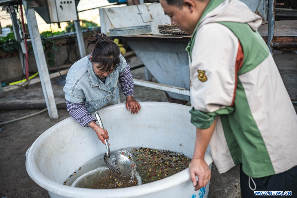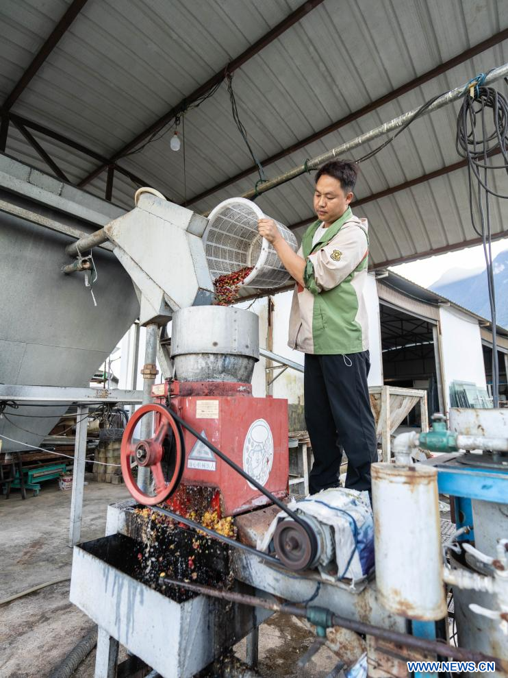 BAOSHAN, 18 novembre (Xinhua) -- Un agriculteur traite des cerises de café fraîchement récoltées dans le village de Xinzhai, à Baoshan, dans la province chinoise du Yunnan (sud-ouest), le 16 novembre 2025. Les caféiers qui y sont cultivés sont récemment entrés dans la saison de récolte. (Photo : Gao Yongwei)