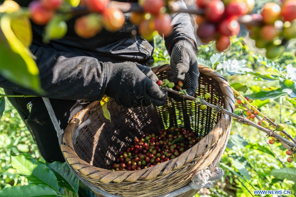 BAOSHAN, 18 novembre (Xinhua) -- Des agriculteurs cueillent des cerises de café dans une plantation située dans le village de Tangxi, à Baoshan, dans la province chinoise du Yunnan (sud-ouest), le 16 novembre 2025. Les caféiers qui y sont cultivés sont récemment entrés dans la saison de récolte. (Photo : Gao Yongwei)