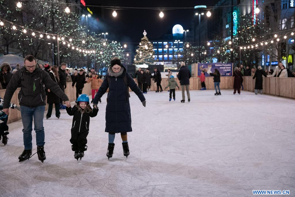 PRAGUE, 30 novembre (Xinhua) -- Des gens patinent sur une patinoire installée dans un marché de Noël à Prague, en République tchèque, le 29 novembre 2025. Le marché de Noël de la Vieille-Ville de Prague a officiellement ouvert ses portes samedi, attirant un grand nombre d'habitants et de touristes. (Xinhua/Dana Kesnerova)