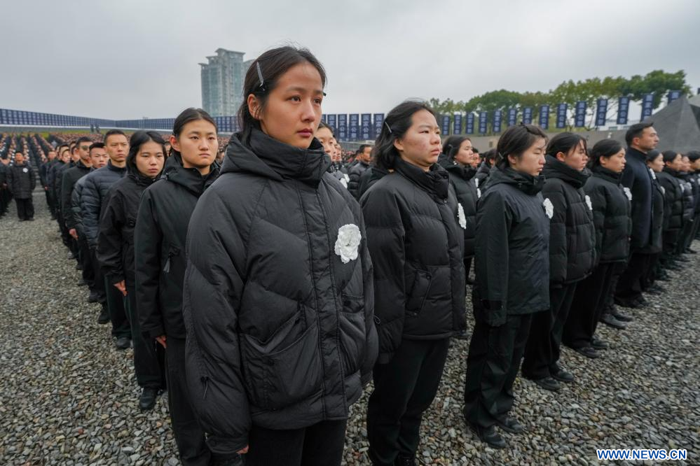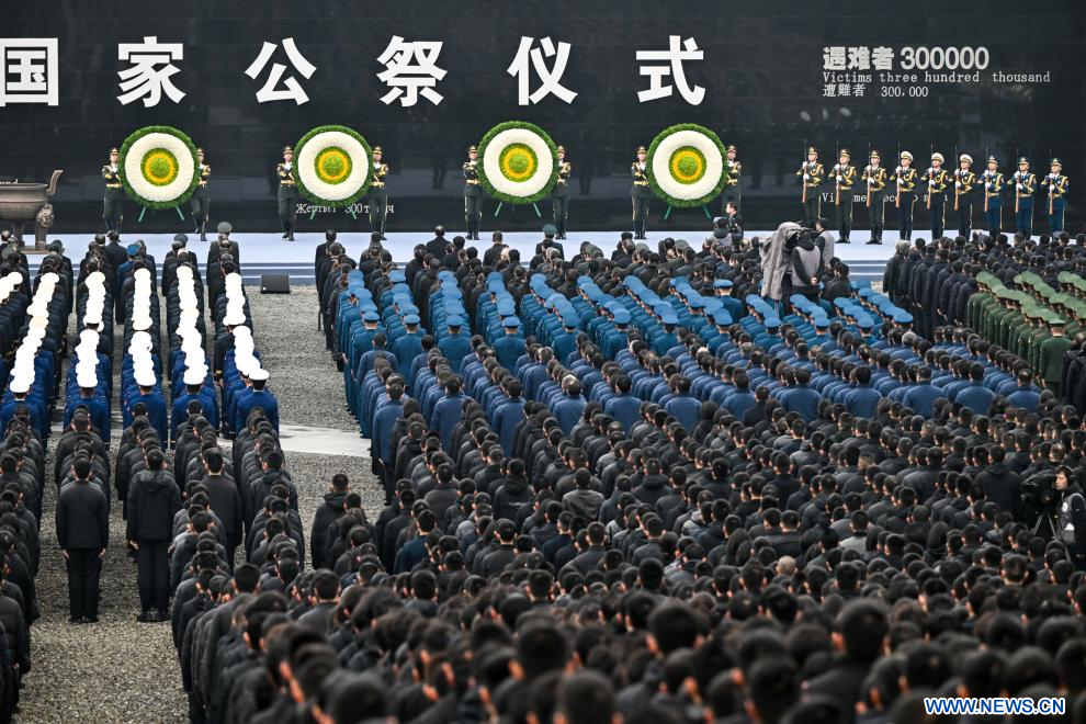 NANJING, 13 décembre (Xinhua) -- La 12e journée nationale de commémoration des victimes du massacre de Nanjing a été observée samedi à Nanjing pour rendre hommage aux 300.000 victimes tuées par les troupes japonaises durant ces atrocités, en cette année de commémoration du 80e anniversaire de la fin de la Seconde Guerre mondiale. Fin