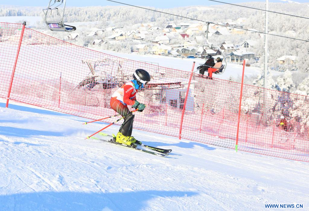 MINSK, 4 février (Xinhua) -- Un skieur s'amuse dans une station de ski de la région de Minsk, au Bélarus, le 3 février 2026. (Xinhua/Henadz Zhinkov)