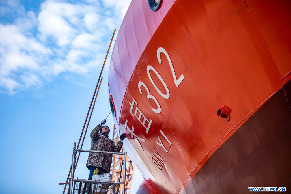 TAIZHOU, 4 février (Xinhua) -- Un ouvrier peint un navire sur un chantier naval de Duchang Shipyard Co., Ltd. à Jiujiang, dans la province chinoise du Jiangxi (est), le 3 janvier 2026.