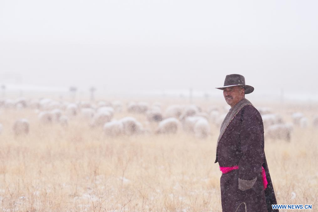 QILIAN, 9 mars (Xinhua) -- Un berger garde son troupeau dans la neige dans le district de Qilian, dans la préfecture autonome tibétaine de Haibei, dans la province chinoise du Qinghai (nord-ouest), le 8 mars 2026. (Photo : Zhang Long)