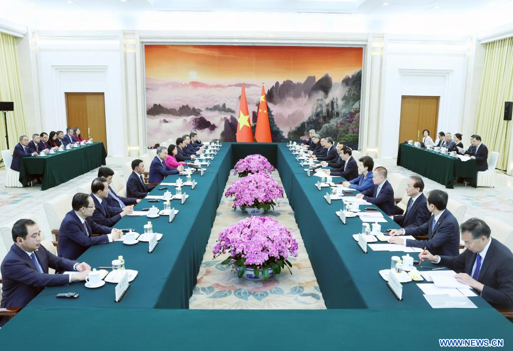 BEIJING, 14 avril (Xinhua) -- Le plus haut conseiller politique de la Chine, Wang Huning, a rencontré To Lam, secrétaire général du Comité central du Parti communiste vietnamien et président vietnamien, mardi à Beijing.